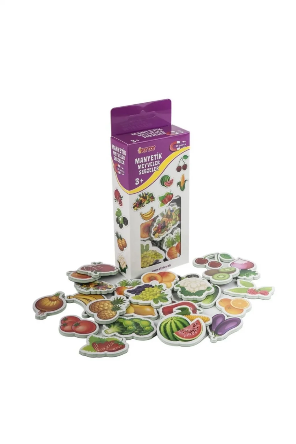 26 adet farklı meyve ve sebze figürü içerir.
