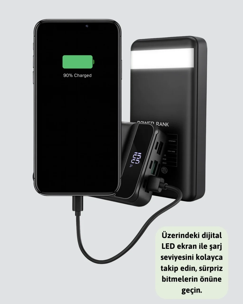 50.000 mAh dev batarya kapasitesine sahip bu powerbank, uzun süreli şarj ihtiyaçlarını karşılamak için özel olarak tasarlanmıştır. Akıllı telefon, tablet, kulaklık, kamera ve USB ile şarj edilebilen tüm cihazlarla uyumlu olan bu cihaz, günlük hayatınızda kesintisiz enerji desteği sunar. Üzerinde bulunan LED dijital gösterge sayesinde mevcut şarj seviyesini kolayca takip edebilir, böylece sürpriz şarj bitmeleri yaşamazsınız. Dört adet USB çıkışı ile aynı anda birden fazla cihazı şarj edebilir, Type-C, Lightning ve Micro USB giriş seçenekleri sayesinde farklı cihazlarla uyumlu kullanım sağlayabilirsiniz. Ultra hızlı şarj özelliği, cihazlarınızı kısa sürede tam kapasiteye ulaştırırken gelişmiş koruma sistemi aşırı ısınma, akım fazlalığı ve kısa devreye karşı güvenli kullanım sunar. Kompakt ve şık tasarımı ile taşınabilirlik açısından da oldukça pratiktir. Özellikle seyahatlerde, işte veya günlük hayatta enerjiye ihtiyaç duyduğunuz her an yanınızda kolayca taşıyabileceğiniz bu ürün, ayrıca dahili LED ışığı sayesinde karanlık ortamlarda ek bir aydınlatma kaynağı da sağlar. 50.000 mAh kapasitesiyle uzun yolculuklarda, kamp aktivitelerinde veya yoğun iş günlerinde güvenilir enerji desteği sunar.