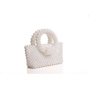 Uzun zincir kollu kapaklı inci çanta beyaz