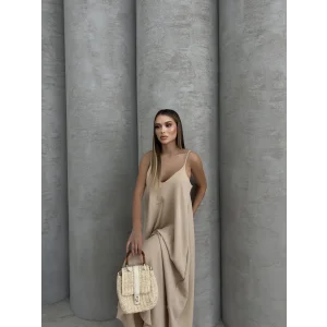 Kuşaklı mdl esnek kumaşlı elbise bej pt
