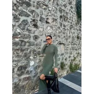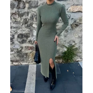 Yırtmaçlı kalın bürümcük uzun elbise Yeşil