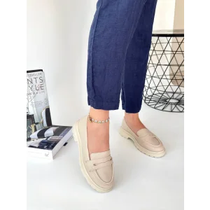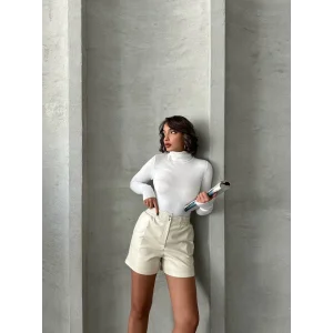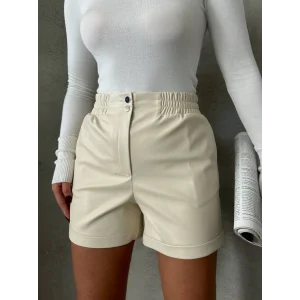 Beli lastikli çıtçıtlı deri şort krem w241007