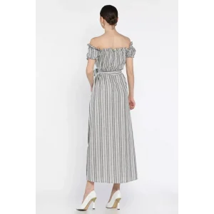 Kuşaklı çizgili mini keten elbise