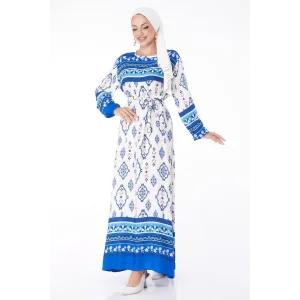 Düz Bisiklet Yaka Kadın Mavi Etnik Desenli Elbise