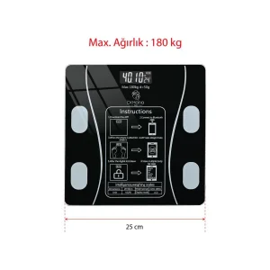 Dijital Baskül Yağ Ölçer Fonksiyonlu Akıllı Baskül Bluetooth Tartı- Siyah