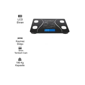 Dijital Tartı Baskül Yağ Su Kas Vücut Kitle Endeksi Kilo Ölçer Tartı Siyah Led Panel