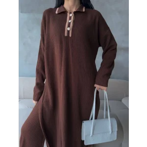 Pantolon yırtmaçlı elbise ikili triko takım kahve elf