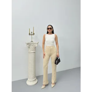 Yüksek bel kesimi ve düz paça tasarımı ile modern bir görünüm sunar.
