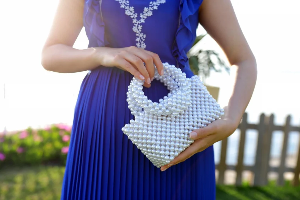 zarif ve şık tasarımıyla öne çıkan incili el yapımı yuvarlak kol çantası, şıklığı ve şıklığı bir arada sunuyor.