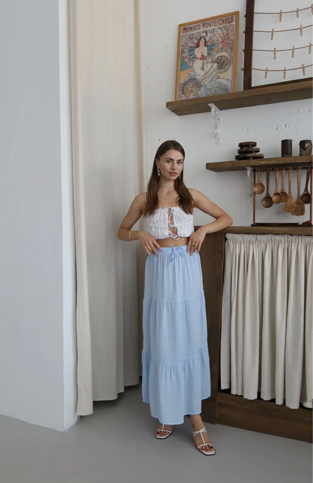 • İnce keten detayları eteğe hareketlilik katmaktadır.