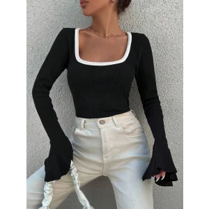 Kare yaka garni detay ispanyol kol bluz siyah a3105