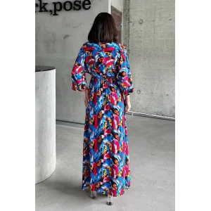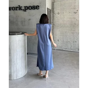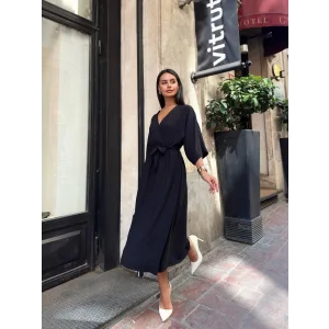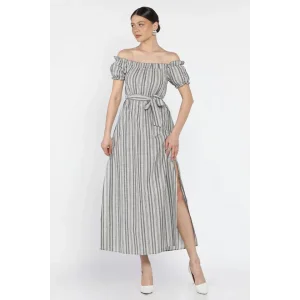 Madonna yaka midi yırtmaçlı kuşaklı keten elbise