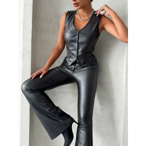 Kaplama düğmeli deri yelek siyah s24398