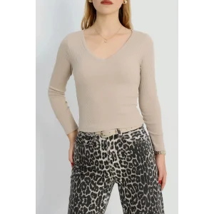 Bisiklet Yaka Parmak Geçmeli Kaşkorse bluz bej a3829