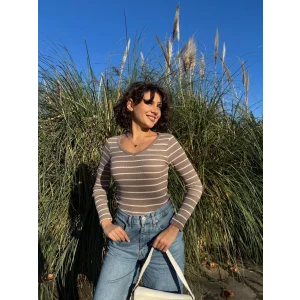 V yaka çizgili bluz bej A3699