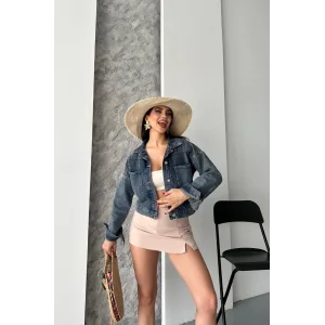 Çift cepli kol katlamalı süper taş enzim yıkama crop kot ceket füme d2000