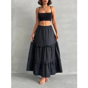 Fırfırlı brodeli astarlı uzun etek siyah s255047