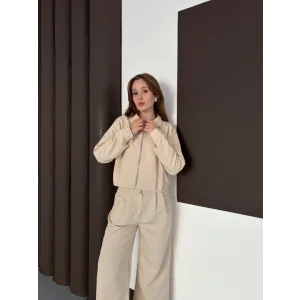 Çok düğmeli kemerli yüksek kaliteli astarlı ceket krem os255859