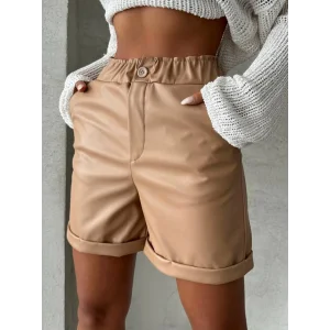 Beli lastikli çıtçıtlı deri şort krem w241007