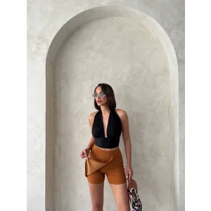 Beli lastikli çıtçıtlı deri şort kahve w241007