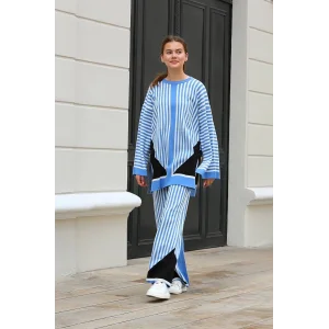 Çizgili bisiklet yaka triko takım Mavi