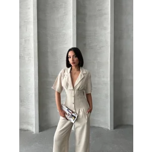 Kuşaklı gömlek yaka salaş tulum bej s255822