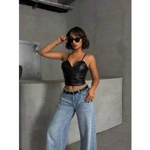 İp askılı yandan fermuarlı rastale deri crop siyah s24113
