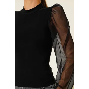 Dik yaka tül kollu bluz siyah t3066