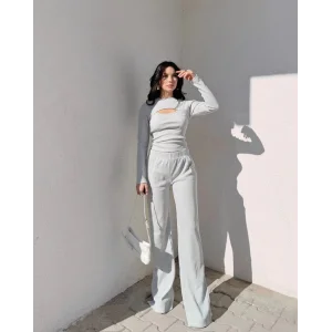 Omuz detaylı kol nakışlı ikili alt üst triko takım kırmızı