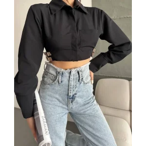 Yanı kemer detaylı crop gömlek siyah s4009