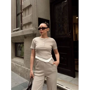 Düğme yakalı bej alt üst takım s3943