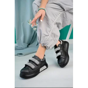 Elika Siyah Cilt Simli Cırt Cırtlı Spor Ayakkabı