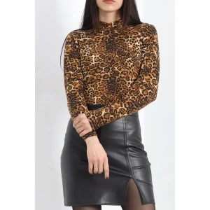 Dik Yaka Desenli Bluz Kahveleo - 19466.1897.