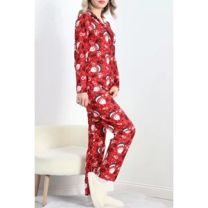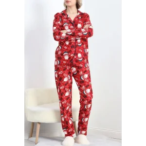 Düğmeli Süet Pijama Takımı Kırmızıbeyaz - 6486.1902.